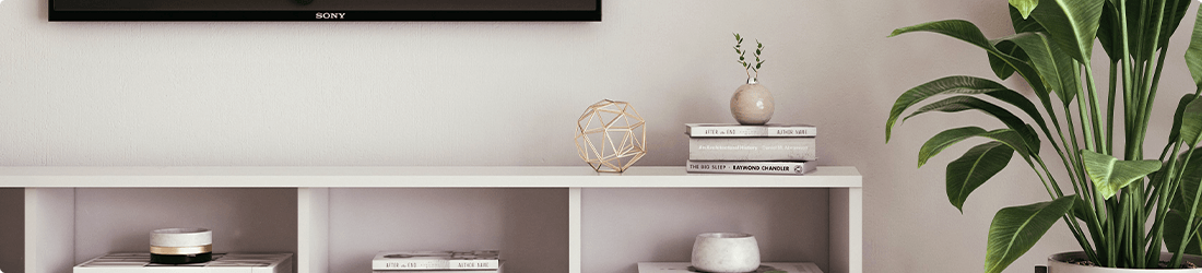 Muitas pessoas perguntam se a TV pode ser mais larga do que o suporte. A resposta é não, certifique-se de que o móvel é maior para proteger a sua TV contra quedas. Preste também atenção à profundidade do móvel, pois deve ter espaço suficiente para a sua TV e equipamentos adicionais. Além da segurança, outra vantagem dum móvel maior é o espaço de arrumação que oferece. Adicione alguns elementos decorativos, um truque usado frequentemente para integrar a tecnologia num design aconchegante.
