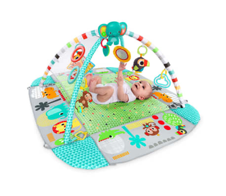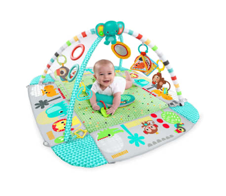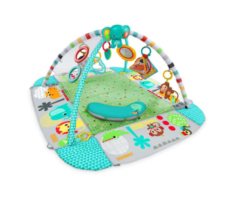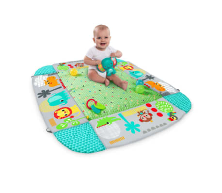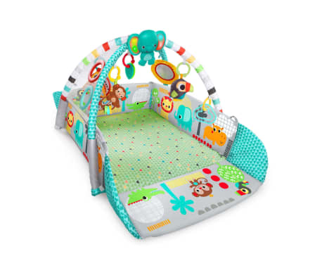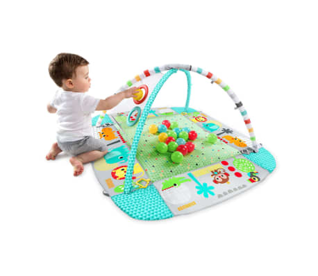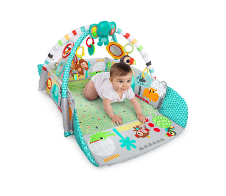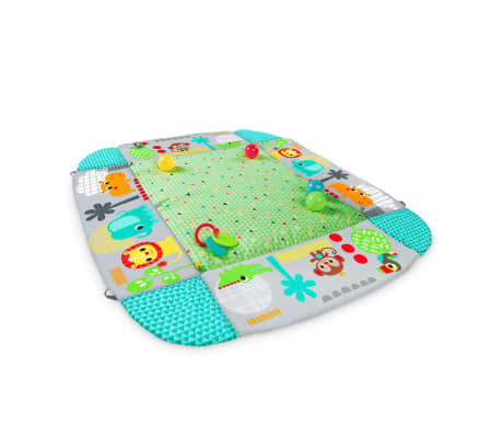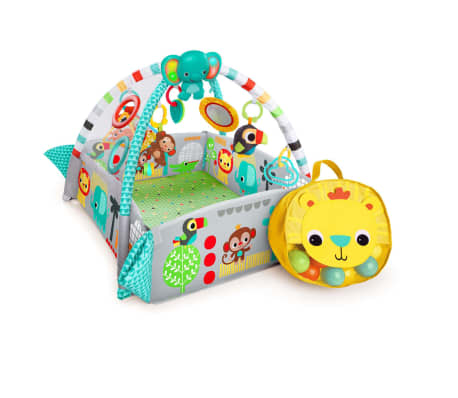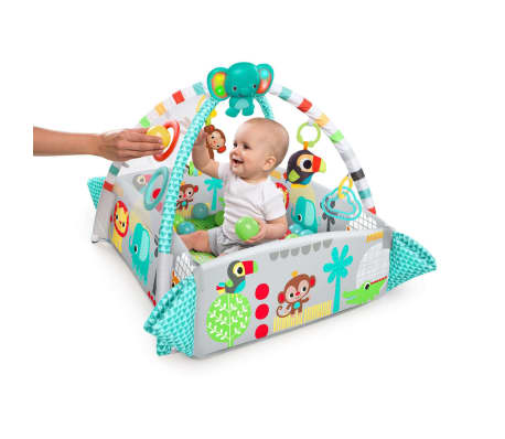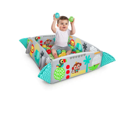 O modo "Paredes para cima" mantém as bolas no interior e atua como uma barreira durante a brincadeira. 35 bolas coloridas alargam o tempo de utilização deste ginásio até o seu bebé ser mais crescido, visto que com as paredes para cima, será um poço de bolas! Os acessórios de brincar incluem um tucano elétrico que entretém o bebé com mais de 20 minutos de melodias alegres. Também inclui um elefante de pelúcia, um macaco e mais brinquedos temáticos da selva tais como mordedores com a forma de folhas, um espelho seguro para bebés "descobre-me", tecidos enrugados, chocalhos, almofada de suporte e até um saco com uma personagem para ajudar o bebé com atividades de "tirar e colocar".