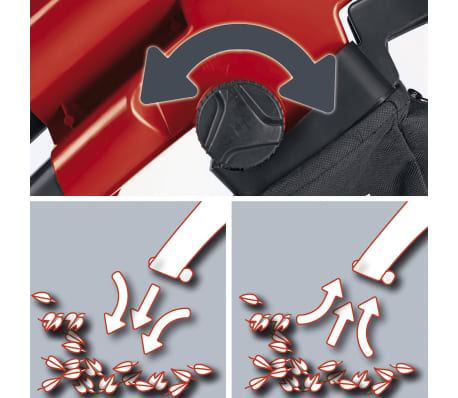 O selector de fácil acesso permite-lhe escolher entre soprar e aspirar. Graças ao controlo de velocidade eletrônico, a velocidade de sucção e vento podem ser precisamente doseadas. Através da alça ajustável este soprador de folhagem elétrico pode ser confortavelmente levado sobre terrenos difíceis. Um grande tubo de sucção de duas peças vai pegar até objetos grandes, como frutas ou pinhas. Para uma manutenção segura há um interruptor de segurança que suspenda a alimentação de energia quando a aba de limpeza é aberta.