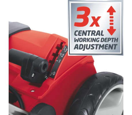 Devido ao seu ajuste de profundidade, de trabalho, em três passos, o escarificador pode ser ajustado às necessidades do solo e da vegetação. Um modo de repouso adicional protege as ferramentas, bem como o solo. A pega é ajustável em altura com fixadores rápidos. As rodas extensas facilitam o trabalho em terrenos difíceis e diminuem o estresse do seu relvado. O saco colector tem um volume de 28 litros.