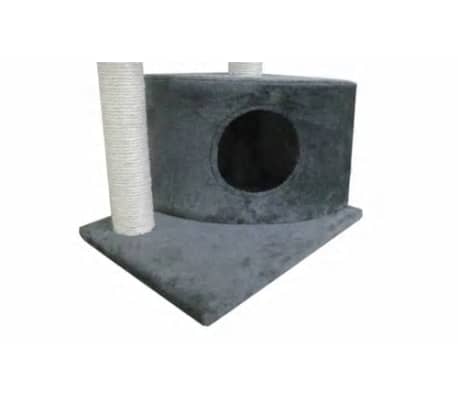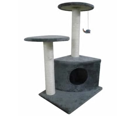 Este arranhador para gatos é coberto com pelúcia cinza suave com cópias da pata pretas. Os postes de arranhões são feitos de sisal durável e o arranhador para gatos foi testado para não conter substâncias perigosas para a saúde. Com este arranhador, o seu gato vai ter o seu próprio pedaço do paraíso em sua casa e um refúgio para relaxar. Este torre de gato tem 1 jogo de rato e duas plataformas para descansar e relaxar.