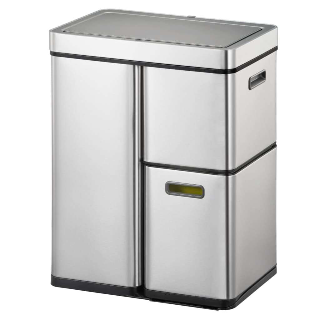 Possui um design empilhado ideal para uma excelente poupança de espaço. O caixote do lixo é feito de aço inoxidável escovado com um revestimento à prova de impressões digitais. A tampa dá acesso a um compartimento espaçoso com um balde interno em plástico de 30 litros e também a um compartimento com um balde interno de 15 litros. Na parte inferior existe um compartimento com um balde interno de 15 litros que é facilmente acessível através da gaveta extraível. O mecanismo do sensor assegura uma utilização higiénica e fecha silenciosamente a tampa. Os sacos dos resíduos são fáceis de trocar graças à tampa removível.