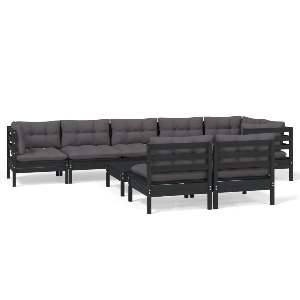 vidaXL 9 pcs conjunto lounge jardim c/ almofadões pinho maciço preto
