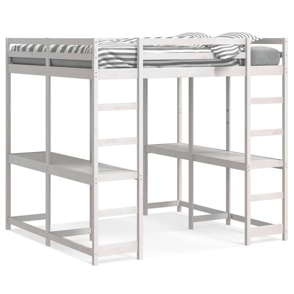 vidaXL Cama alta c/ secretária e escada 180x200 cm pinho maciço branco