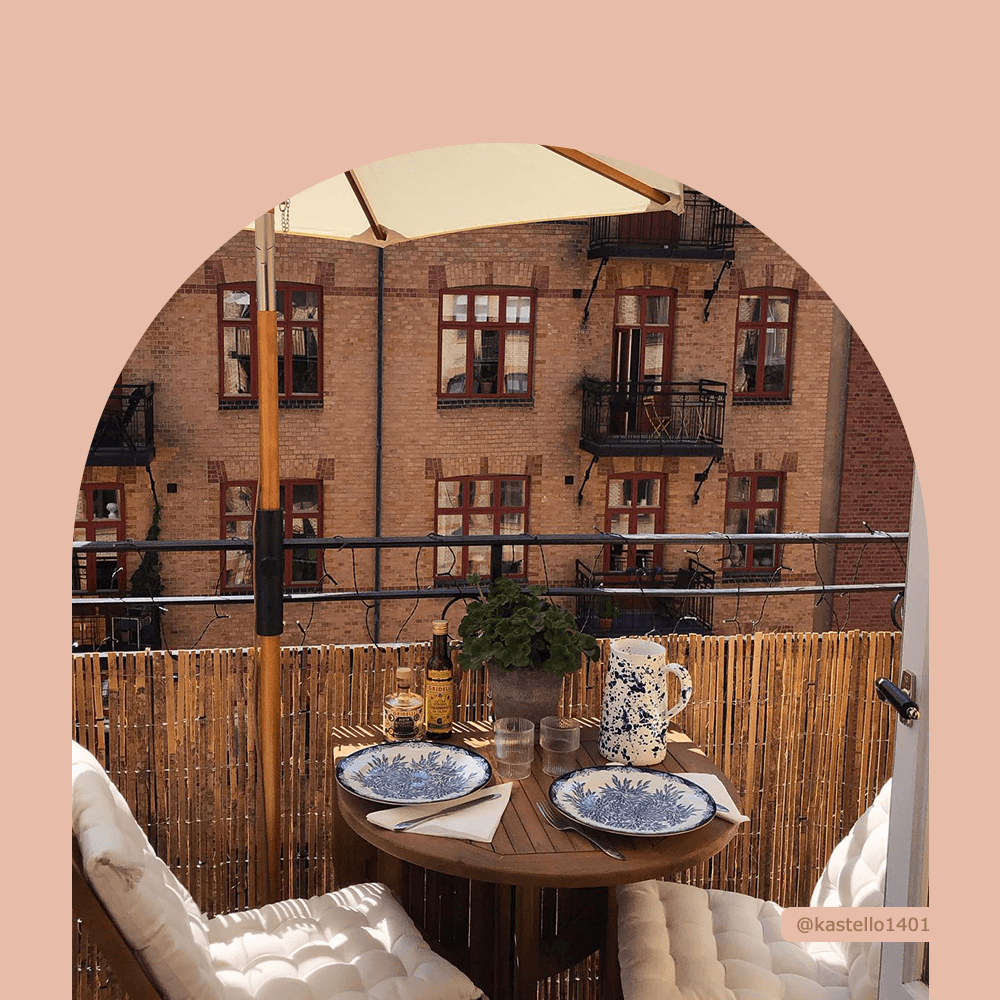 Dica útil: se for abençoado com uma varanda, vai querer aproveitar ao máximo o tempo que passa ao ar livre, independentemente do clima. Para se proteger dos fortes raios UV e ter alguma privacidade, recomendamos a instalação de um guarda-sol de parede ou uma tela de varanda. Em adição, mantas macias e confortáveis aquecerão nas noites frias sem forçá-lo a entrar em casa. Por isso são obrigatórios na sua lista de decoração da varanda.